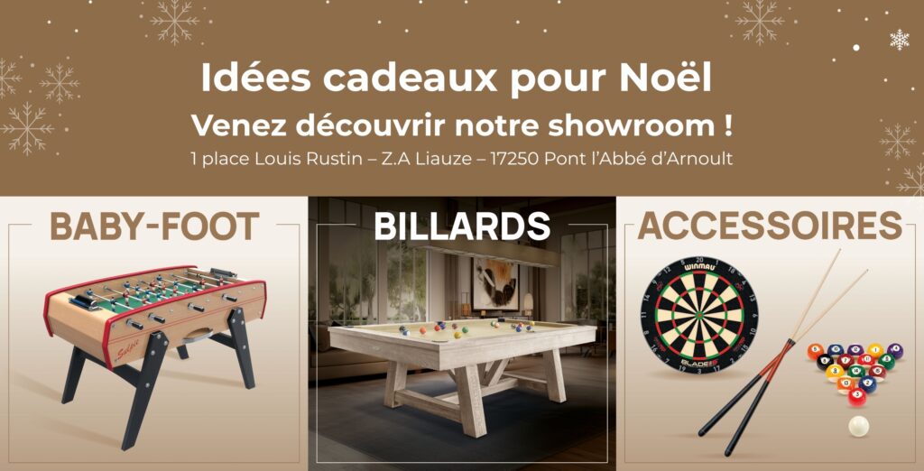 Tous nos produits sont entièrement réalisés dans nos ateliers de Pont l’Abbé d’Arnoult en Charente Maritime. Livraisons et montages par nos soins sur toute la France, possibilité d’expédier à l’étranger avec montage externe. Venez découvrir notre showroom de 450 m² : billards, accessoires de billard, baby-foot et comptoirs.